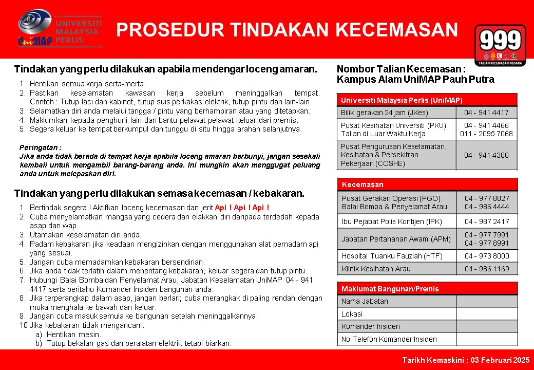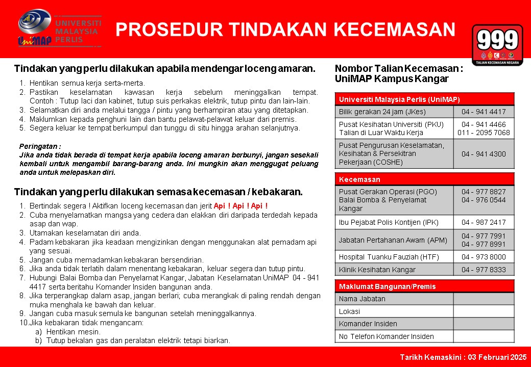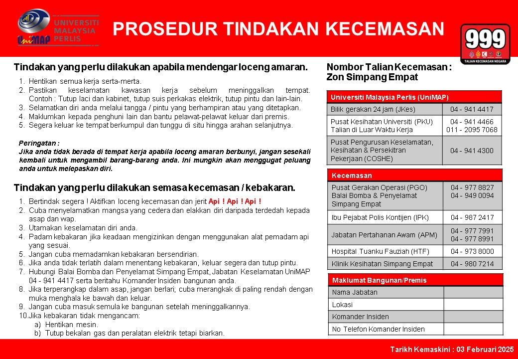 Prosedur Tindakan Kecemasan telah dibangunkan berdasarkan 4 kampus/zon utama UniMAP: