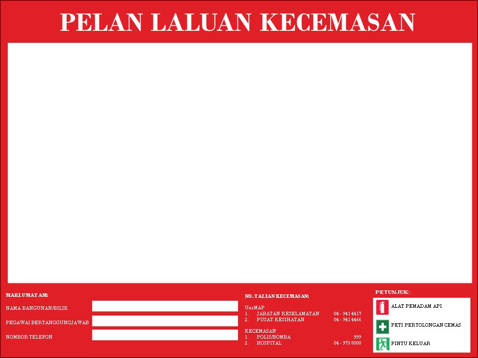 Prosedur Tindakan Kecemasan hendaklah dipamerkan di tempat-tempat strategik dan mudah dilihat oleh setiap penghuni pada setiap bilik, aras bangunan dan di dalam lif.